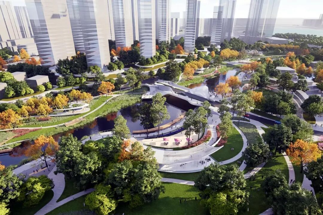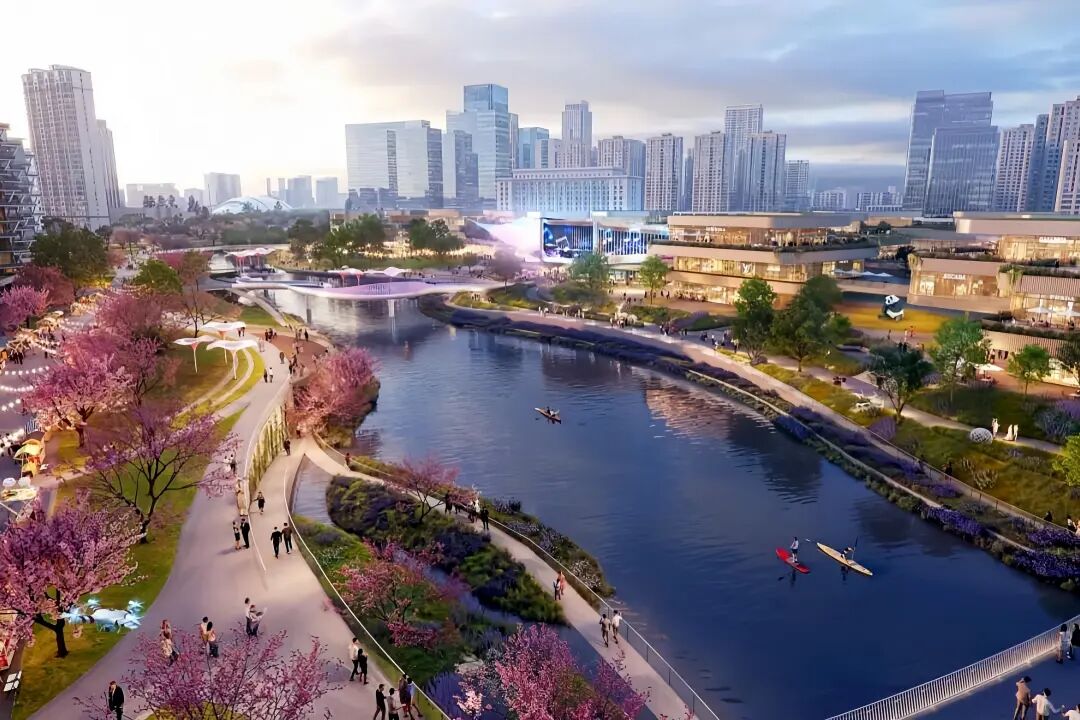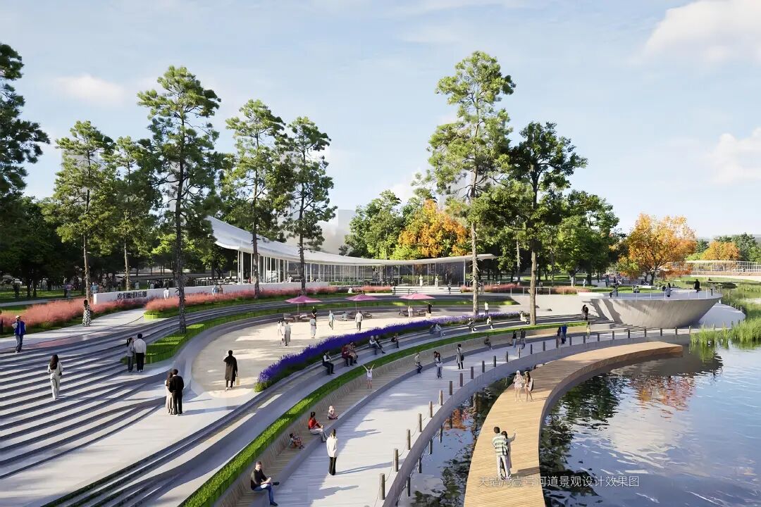 该方案以河谷、湖畔、城市同兴共建为出发点,对滨水景观及沿岸商业进行立体重塑,形成一条具有生命张力的空间叙事轴线,呈现从宏大到细腻、从静态到动态的场景转换脉络。