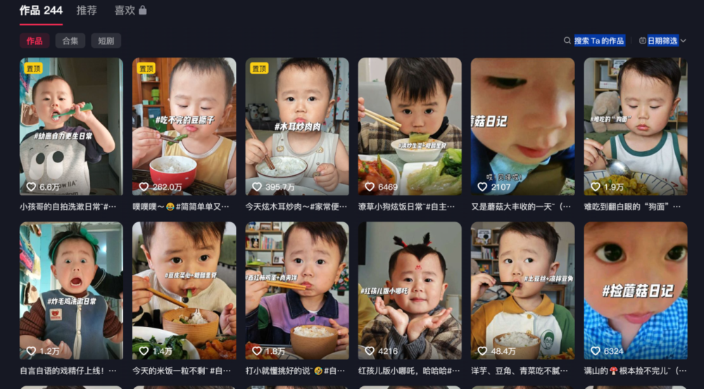 “老品种小孩”也是“老式人类”的热门分支,早就在抖音幼崽吃播区开辟了赛道。