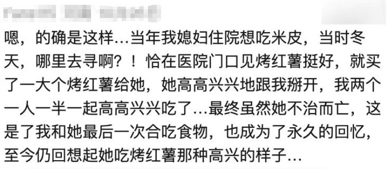 社交媒体上,这是极易引发共鸣的话题。人们分享不同城市、医院门口的相似经历,几乎都有难忘的“医院门口烤红薯”记忆。
