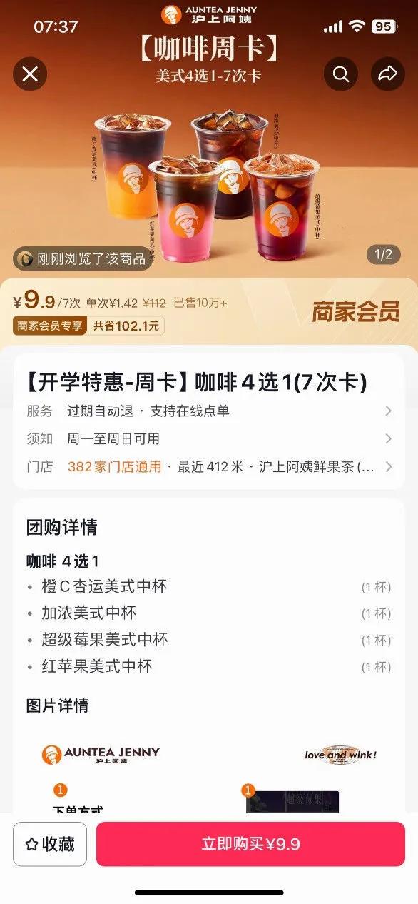 iBrandi品创观察到,茶百道自去年9月起已在四川、广东、上海等地部分门店低调测试现磨咖啡,定价区间为6.9元至12.9元;沪上阿姨近期在校园门店推出咖啡周卡,9.9元可使用7次,单杯折合仅1.42元;蜜雪冰城也传出试水现磨咖啡的消息,目前处于前期规划与小范围测试阶段,不仅计划引入咖啡机,还同步升级咖啡豆、牛奶及产品线。