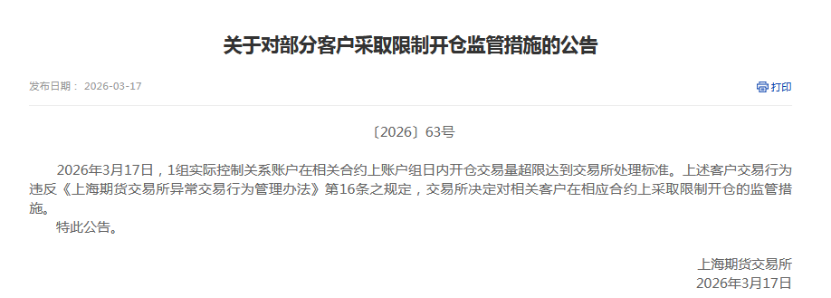 3月17日,上海期货交易所发布公告称,有1组实际控制关系账户在相关期货合约交易中,日内开仓交易量超出交易所规定标准。依据相关规则,交易所决定对该组客户在对应合约上采取限制开仓的监管措施。