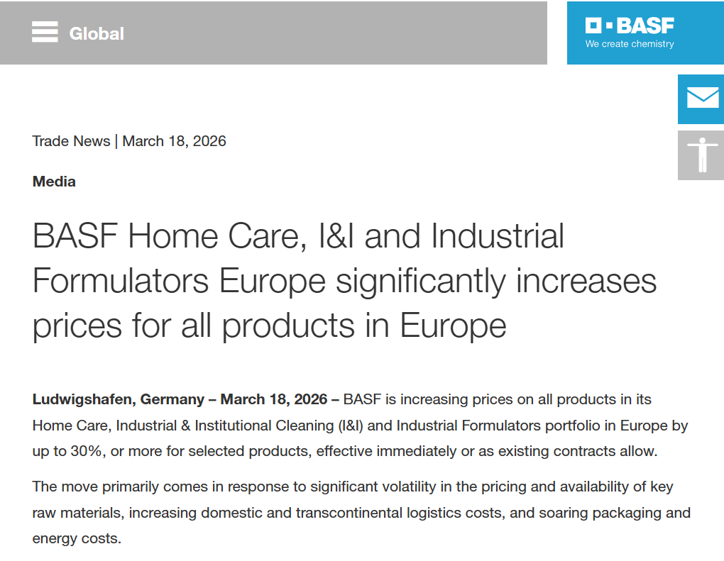 全球化工行业巨头巴斯夫(BASF)于周三发布声明,宣布将对其欧洲地区家用护理、工业与机构清洁(I&I)以及工业配方业务组合中的所有产品进行提价,涨幅最高可达30%,部分产品甚至“涨幅更高”。