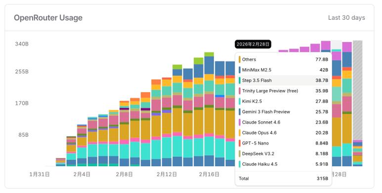 第三重利好是海外增量。此前,海外用户大多依赖GPT-5、Claude等模型,但这些顶级“虾粮”价格过高,不少用户开始尝试国产“虾粮”,这让国产模厂在海外市场也获得了收益。在OpenRouter的龙虾模型调用量榜单上,国产模型占比已超过一半,Step 3.5 Flash、MiniMax M2.5、Kimi K2.5作为“国产龙虾三剑客”,成为“虾粮”市场的主力军。