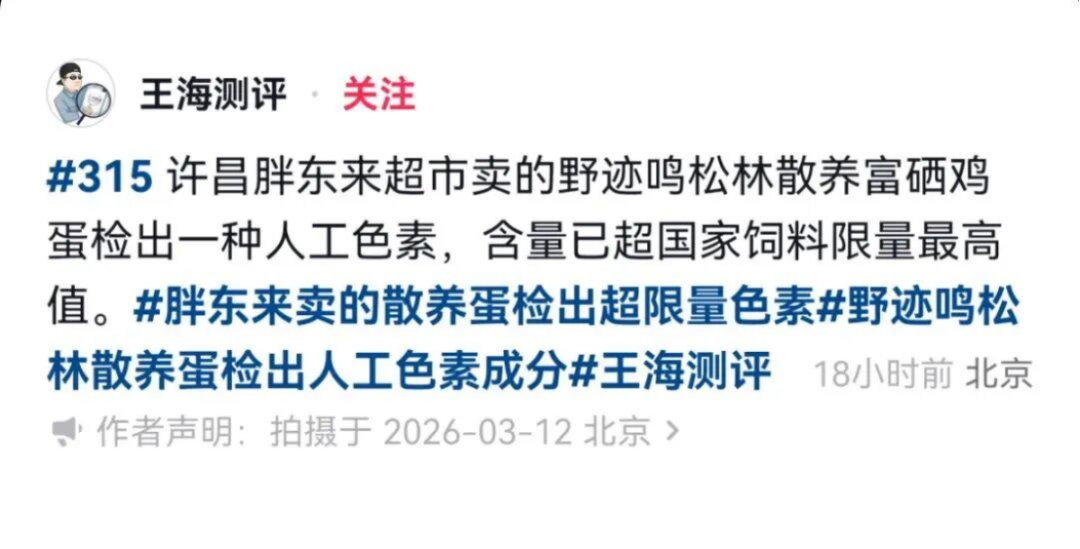 3月15日,胖东来发布官方声明,指出王海团队关键错误:适用标准不当。声明称国家无鸡蛋中角黄素残留量的专门国家标准,用饲料添加标准评判鸡蛋产品无法律依据、不符合科学逻辑。