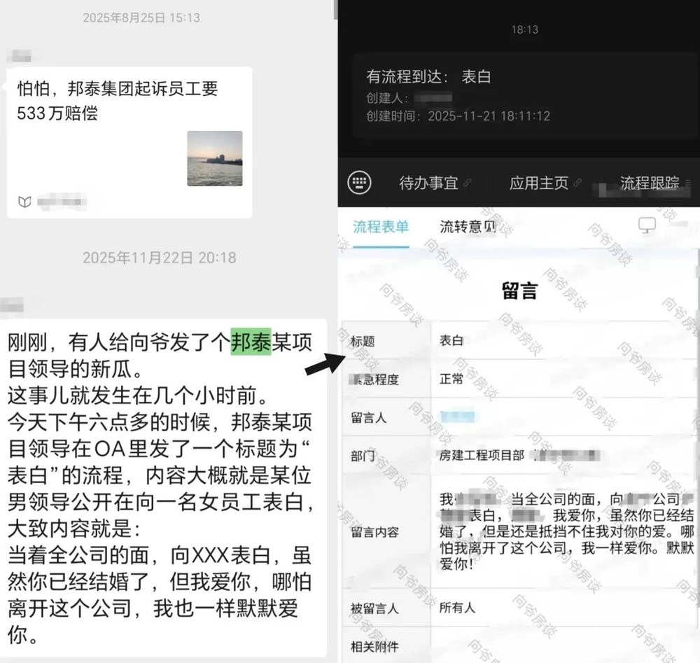 然而面对这些争议,邦泰似乎更在意内部爆料,如“起诉员工索赔533万”“OA系统女员工表白已婚男领导”,两则消息刚出现便被压制。