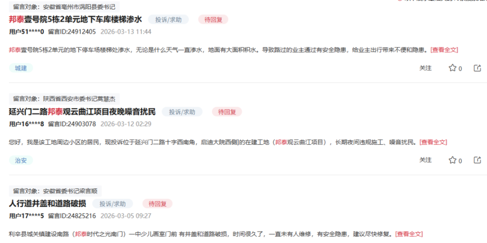 在人民留言板和问诊四川的最新投诉中,房屋质量问题仍是焦点,如邦泰壹号院车库楼梯渗水、邦泰时代之光人形道路破损、邦泰熙华天骄地下车库出入口安全隐患等。