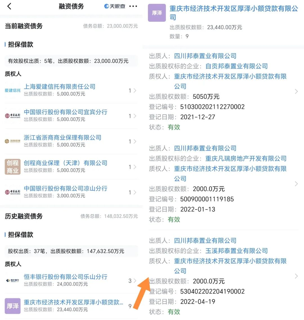 14.8亿元历史出质(部分仍有效)中,邦泰向重庆厚泽小额贷款有限公司融资最多,为广元、德阳等城市项目公司提供9笔质押融资,总计2.344亿元,而该公司主体及老板国籍已迁出中国大陆。