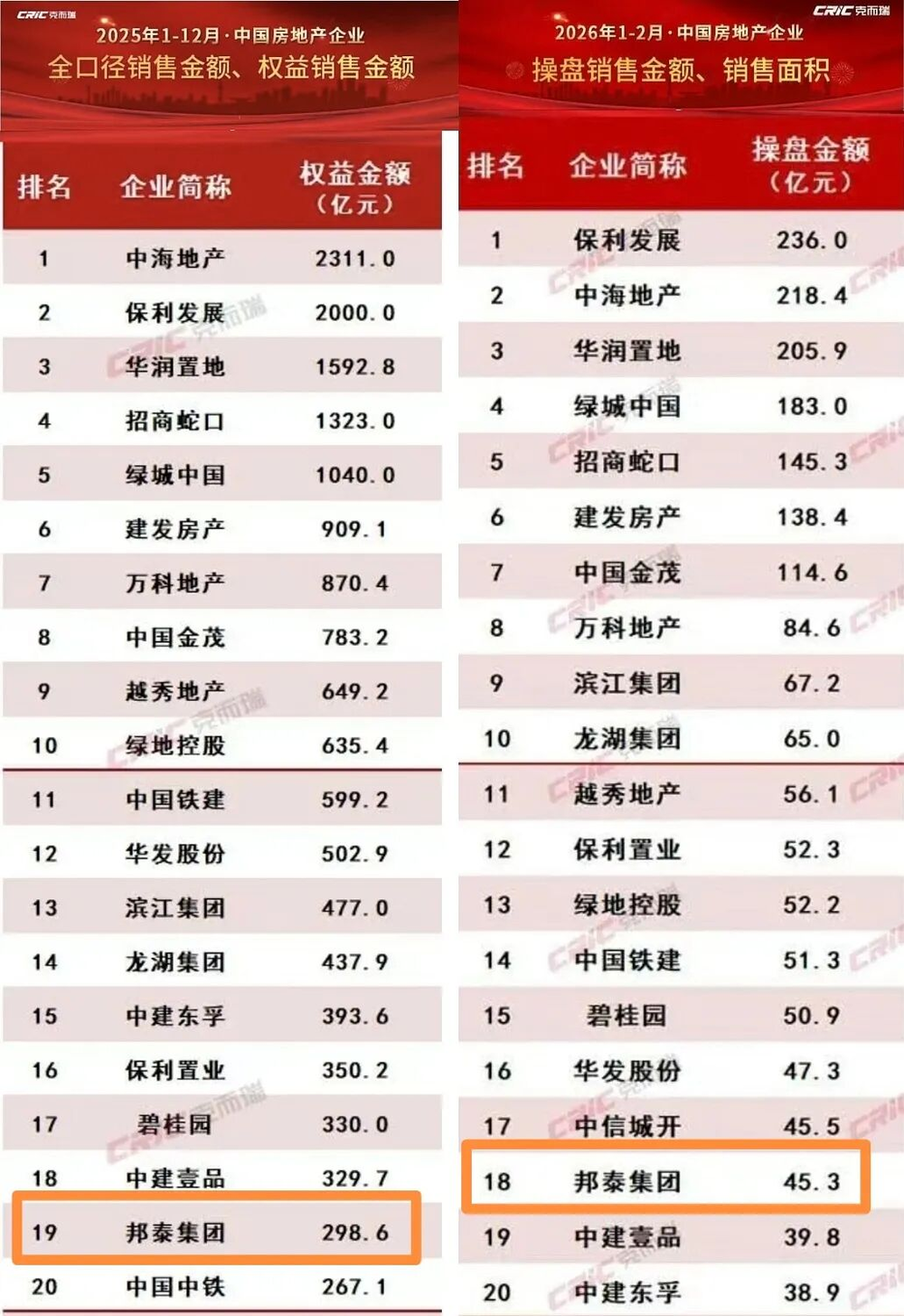 2026年1-2月,邦泰进一步攀升至全国房企操盘销售榜第18位,民营房企第4的位置保持不变。此外,邦泰去年在房企权益拿地金额榜单中排第13位。