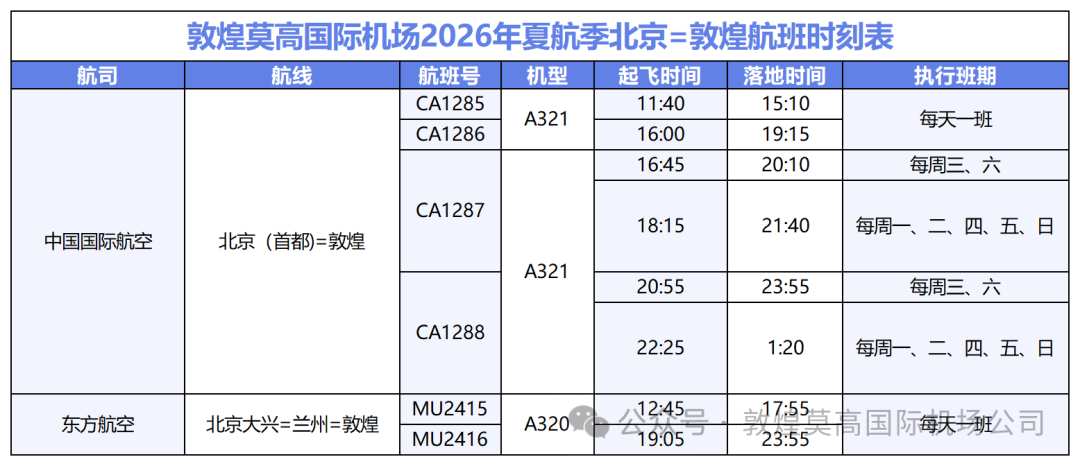 为进一步加强敦煌与北京的空中联系,优化航线网络布局,为两地旅客打造更高效、便捷、舒适的“空中通道”,自3月29日起,敦煌莫高国际机场的北京至敦煌航班将增加至每日3班。其中,北京首都至敦煌每日两班,北京大兴至敦煌每日一班,为旅客提供双机场、多时段的选择,旅客可根据自身行程灵活挑选起飞机场和航班时间,大幅减少旅途时间。尤其是直飞航班的恢复,让北京到敦煌的飞行时长缩短至3.5小时。