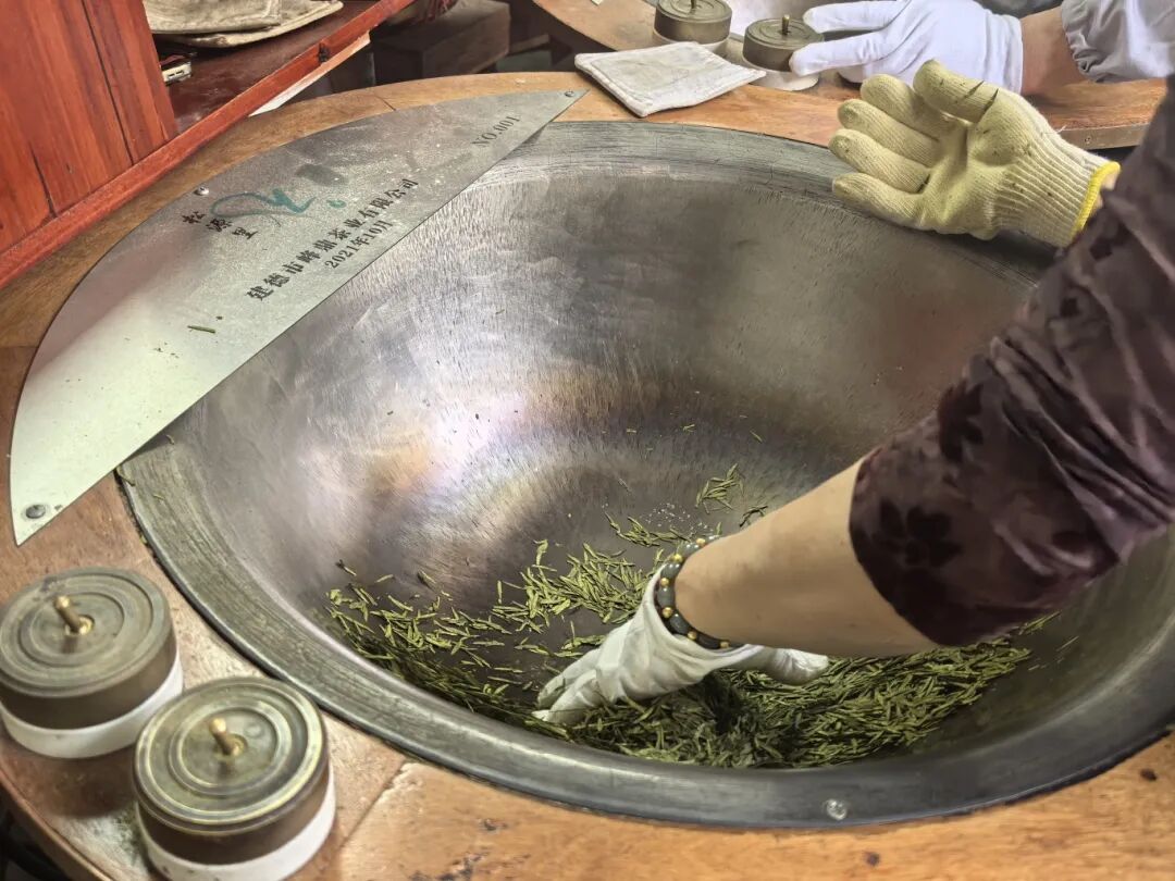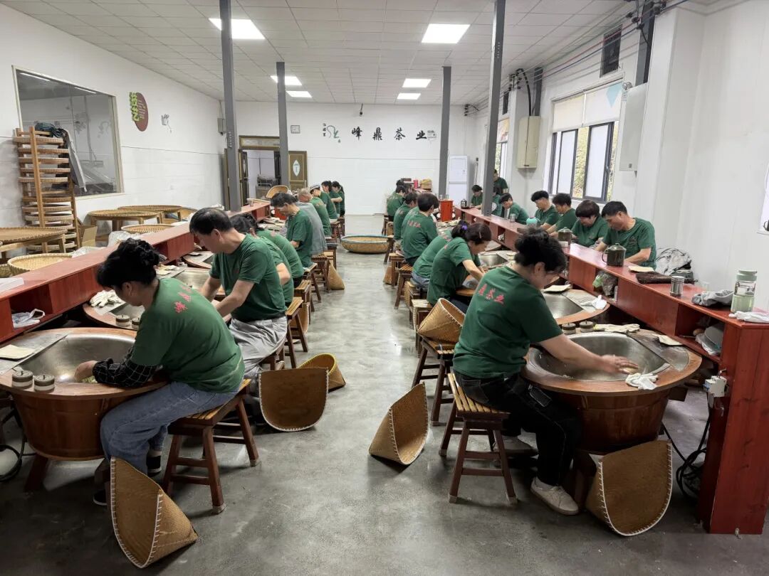 开采当天,400名采茶工同时开工,熟练工一天最多能采12-13斤鲜叶。一名师傅一天可炒制3斤干茶(大约需要15斤鲜叶)。
