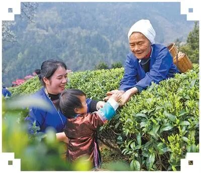 广西柳州市三江侗族自治县八江镇归令村,当地一户人家的祖孙三人在茶园中一同采摘春茶。(粟勇主 摄)
