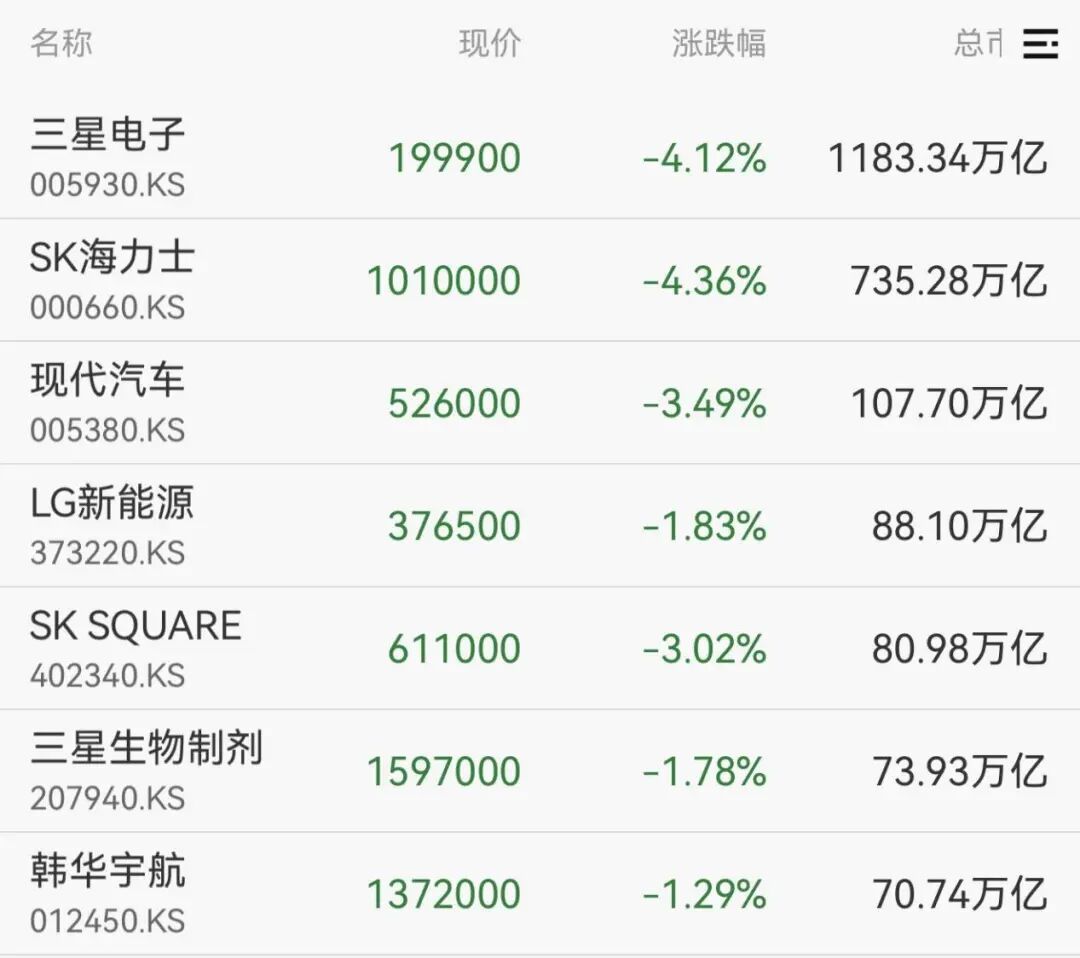 权重股方面,三星电子、SK海力士的跌幅均超过4%。