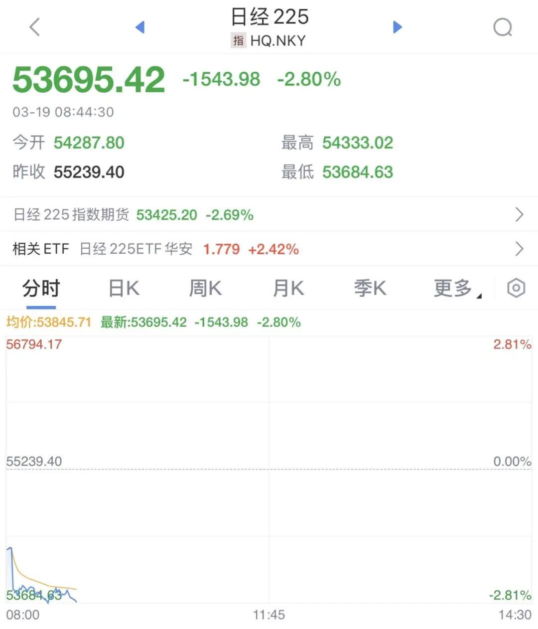 另外,日经225指数跌幅扩大至2.8%,当前报53695.42点。