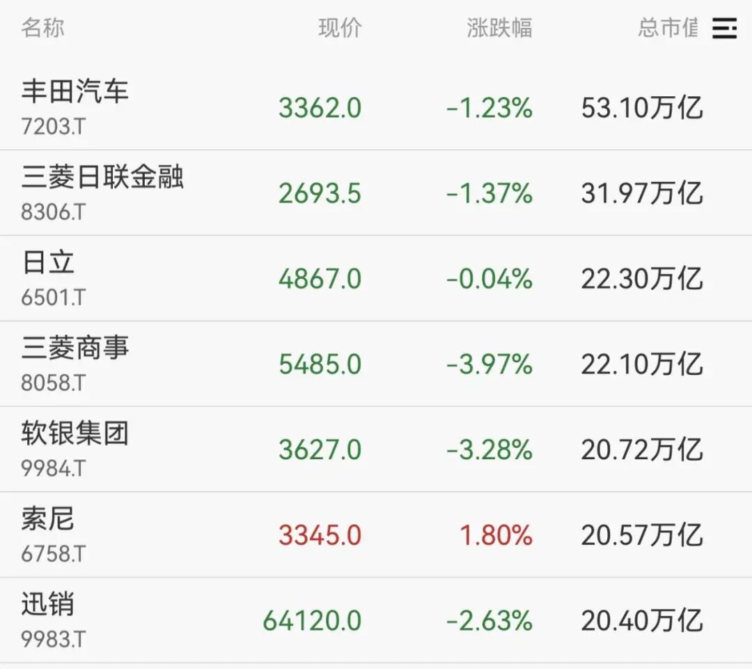 权重股方面,三菱商事、软银集团、迅销等的跌幅均超过2%。