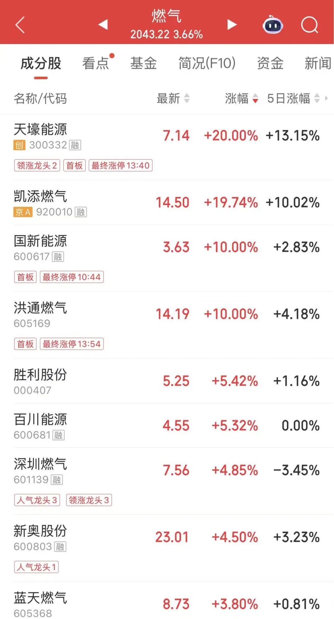午后,天然气板块持续走高,不过尾盘涨幅有所收窄,蓝焰控股涨停。