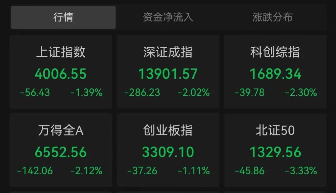 近期上证指数呈现持续回落态势,今日盘中跌幅超过1.6%,自1月6日以来首次跌破4000点整数关口,最低触及3994.17点。截至当日收盘,上证指数下跌1.39%,报收4006.55点;深证成指跌幅达2.02%,创业板指下跌1.11%,科创综指跌幅为2.3%。