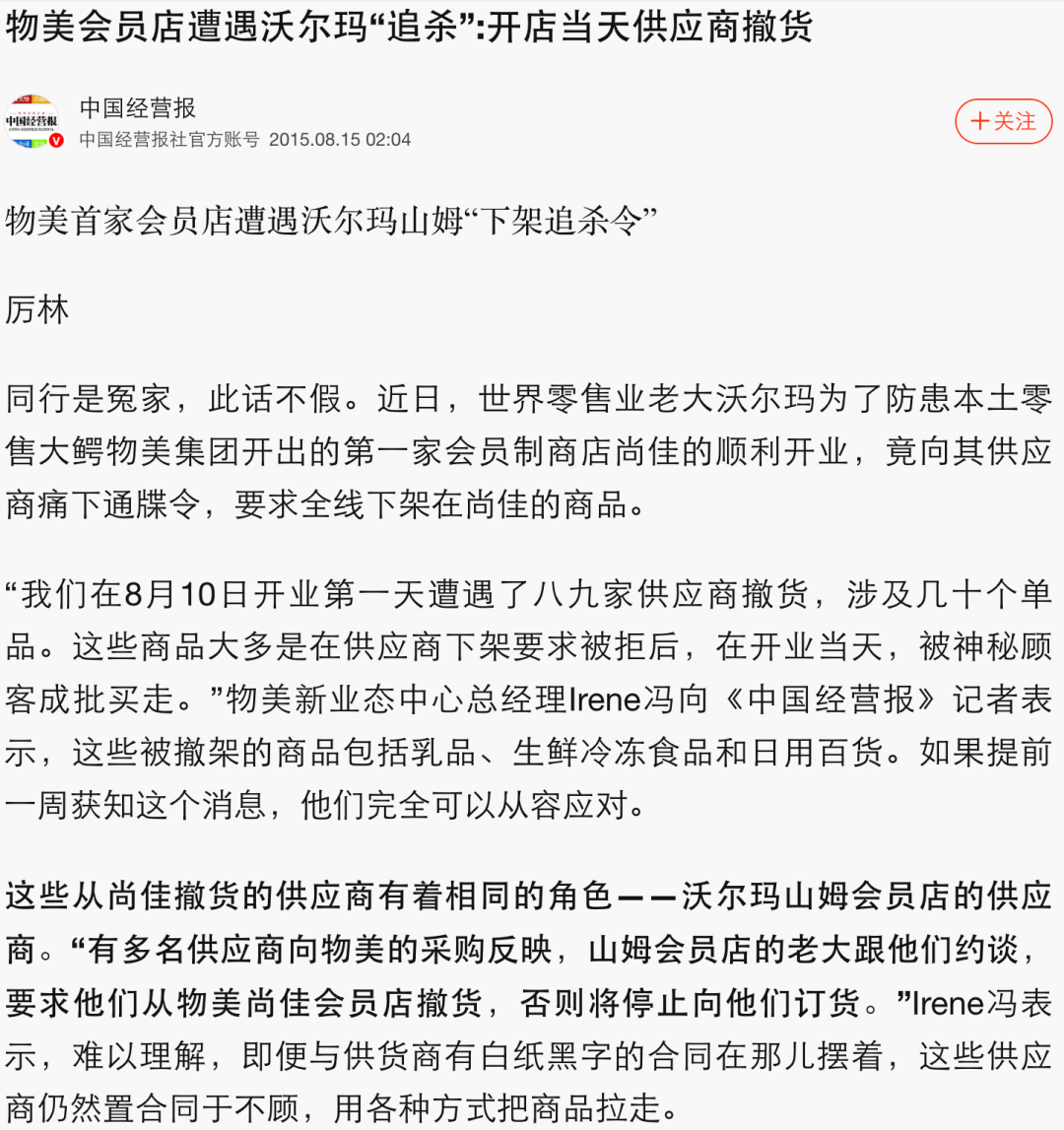 盒马随即声援,称其X会员店开业时也遇类似情况,供应商长期受山姆“二选一”压力。这还牵出旧事:2015年物美“尚佳”会员店开业,同样遭供应商撤货、货架被买空,山姆被指约谈供应商并威胁停订货,还监控竞品价格实时调价。
