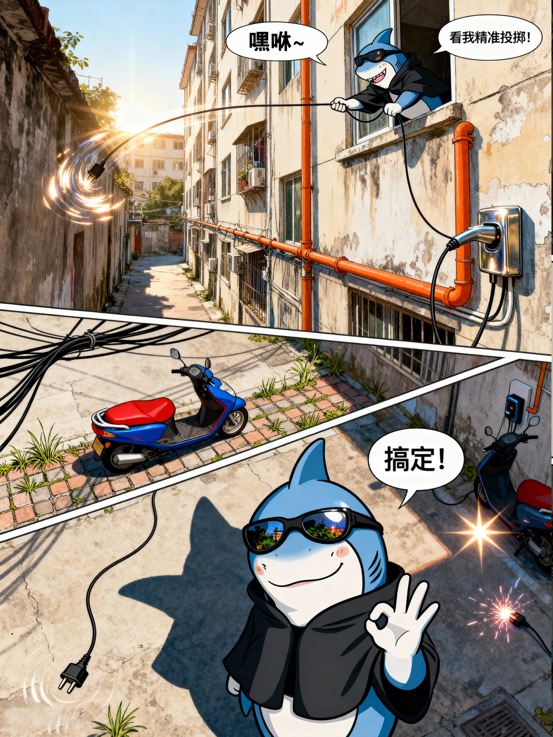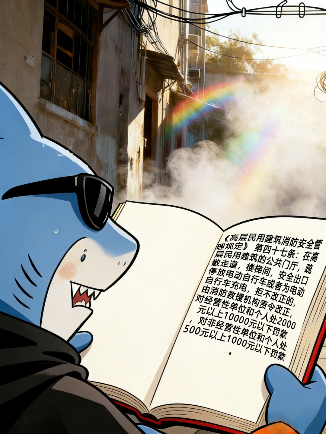 楼道飞线充电存在诸多安全隐患,许多人因贪图一时便利,把安全问题抛诸脑后。这不,宁鲨鲨正打算在楼道私拉电线给电动车充电,危险行为眼看就要发生……