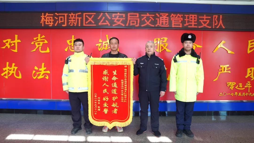 3月18日,柳河县凉水河子镇的居民刘祥东带着满心感激,把一面写有“生命通道护航者 感谢人民好交警”的锦旗,亲自送到了梅河新区公安局交通管理支队城区管理大队苏文博和王海龙的手中。