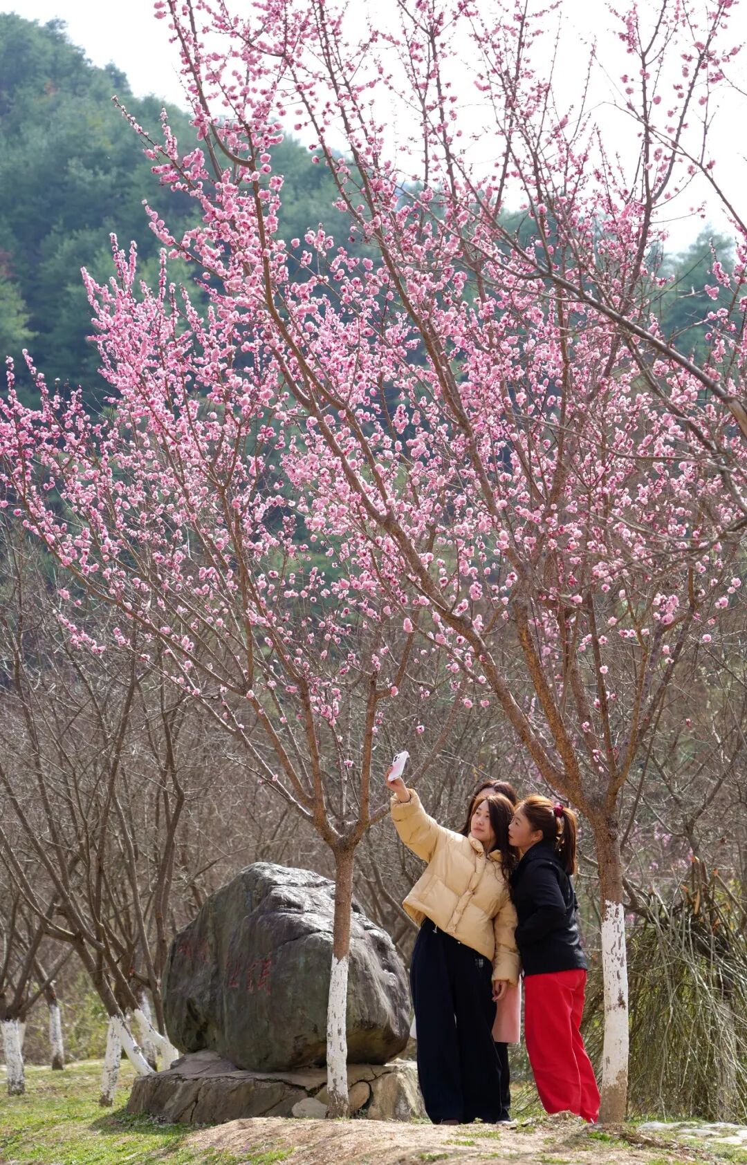 顺着山势望去,桃树层层铺展如粉色梯田,直抵云端。