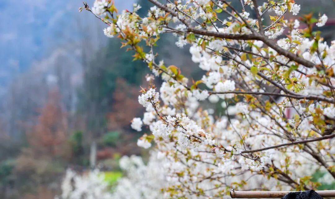 要写樱花开得热烈张扬,一夜之间让村庄覆上皑皑“白雪”;