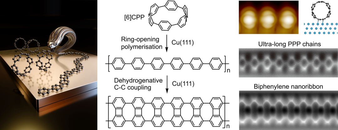 近日,中国科学技术大学范其瑭教授团队联合苏州大学仲启刚教授、德国马尔堡大学J. Michael Gottfried教授、吉森大学André Schirmeisen教授等研究人员,在超长共轭聚合物与非苯型碳纳米材料的表面精准合成领域斩获突破性成果。该团队首次采用自由基开环聚合(ROP)策略,在Cu(111)表面成功制备出微米级的超长聚对苯撑(PPP)链,并以此为前驱体,实现了结构精确的非苯型联苯烯纳米带(BPR)的合成(图1)。北京时间2026年3月16日,相关研究成果以“On-surface radical ring-opening polymerization produces ultralong poly(para-phenylene) for access to non-benzenoid carbon nanoribbons”为题,发表于《Nature Chemistry》期刊。