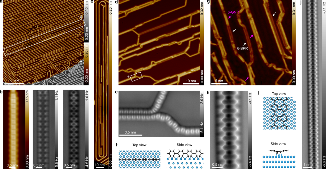 此外,在洁净表面生成的这些超长PPP链具有极高的化学纯度。经过后续退火处理,PPP链会发生选择性C−H键断裂,形成聚对苯炔(PPB)中间体(图2d-f),最终侧向耦合为无取代的非苯型联苯烯纳米带(6-BPR,图2g-j)。实验观测到的BPR长度可达40纳米,远超此前通过脱氢氟化方法合成的同类材料。这一成果打破了PPP前驱体在金属表面通常仅能生成苯型扶手椅边石墨烯纳米带(AGNRs)的局限,为非苯型碳纳米材料的精准制备开辟了新路径。