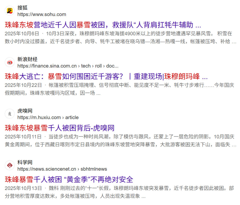 2025年10月4日,一场罕见暴风雪突袭珠峰东坡,能见度不足1米,垭口被积雪覆盖,近千名徒步者被困晓乌错、汤湘等营地,帐篷被压塌。有徒步者回忆:“晚上十点开始下雪,半小时帐篷就埋到腰,雪从门帘缝隙灌进来。”