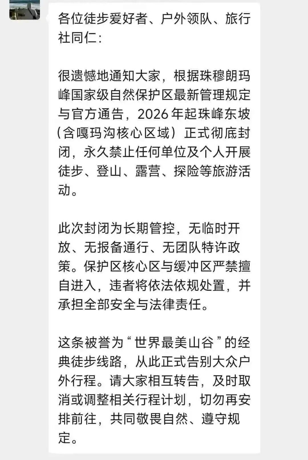 起初,当地官方公众号定日县发布的封禁通告让户外爱好者们人心惶惶,尽管推文很快被删除,但2026年3月16日曲当乡的微信通告彻底打破了大家的幻想。没有缓冲期,没有倒计时,曾经如火如荼招募队员、即将迎来最美杜鹃花季的珠峰东坡,一夜之间成为了徒步者心中的遗憾。