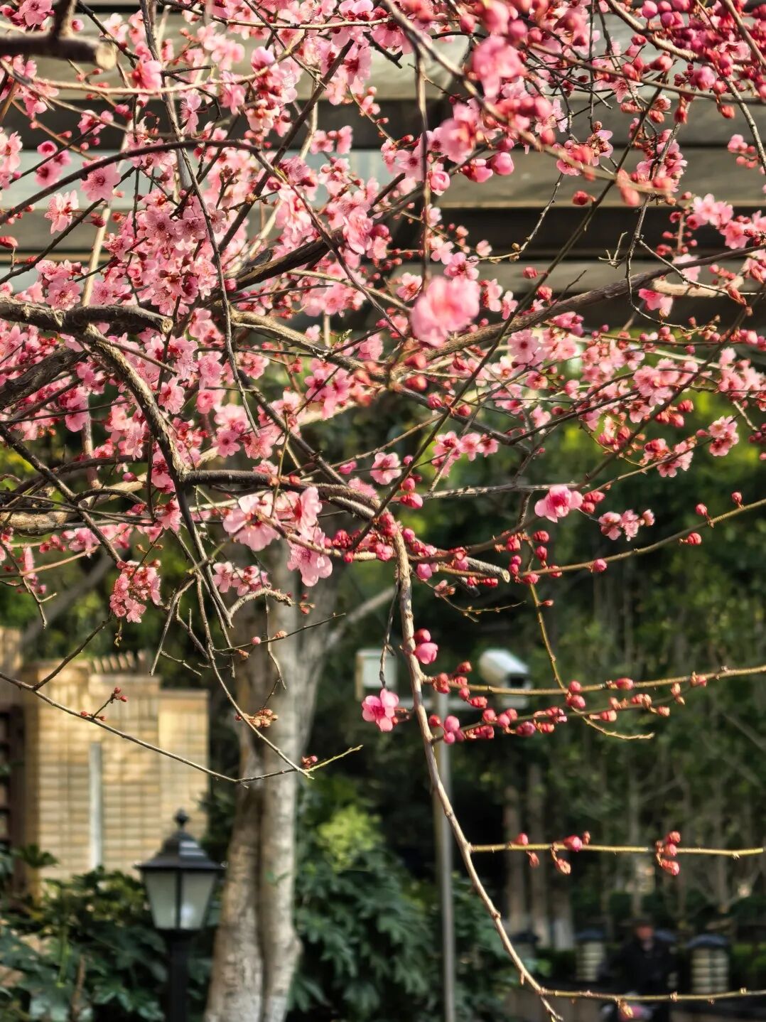 “江南无所有,聊赠一枝春”,未来街区路边的梅花正傲然绽放,远远望去,粉色的花簇像轻烟萦绕枝头。
