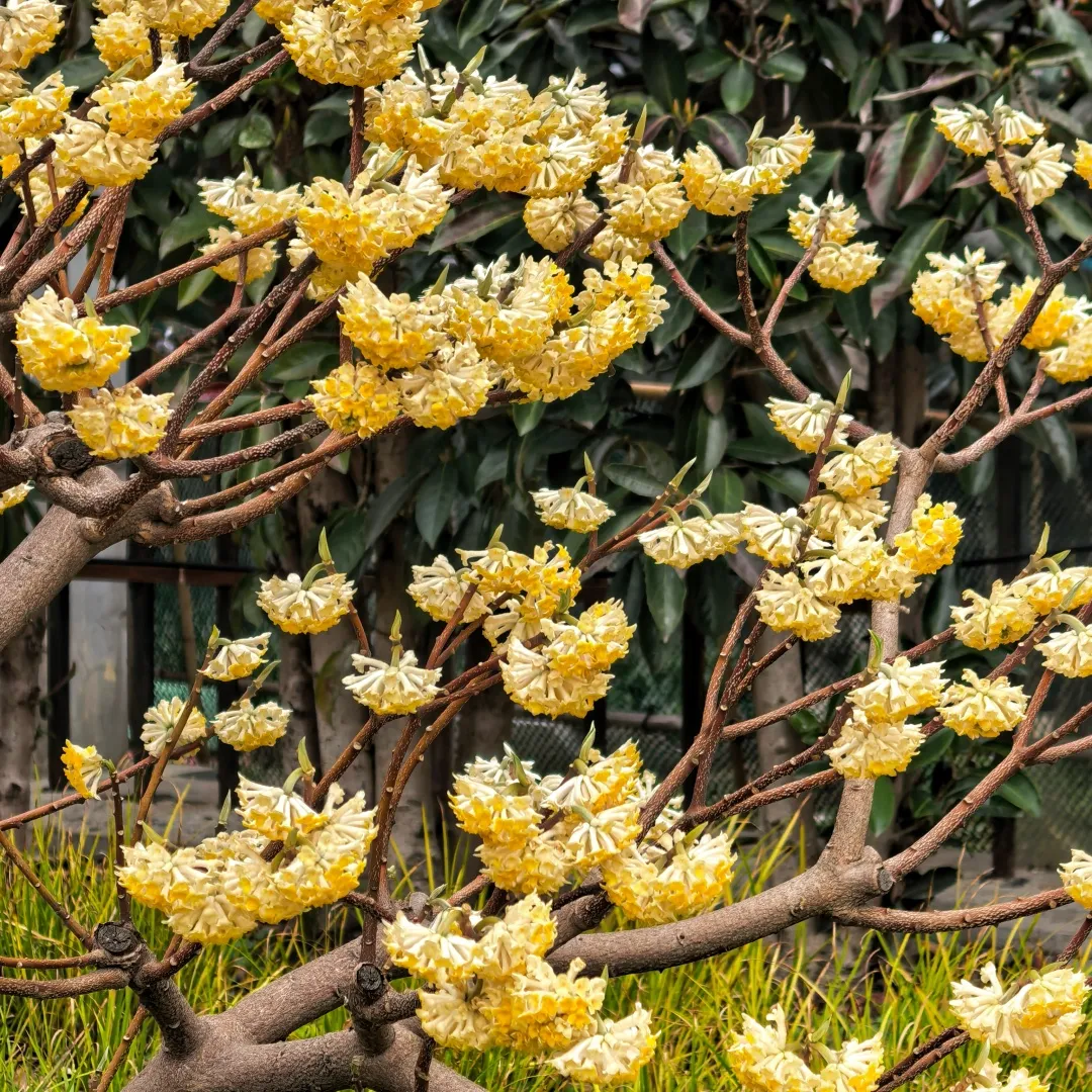 路旁的灌木丛里,金黄色的结香花像繁星般簇拥在枝头,它先开花后长叶,姿态优雅,低垂的花朵如同小巧的铃铛。