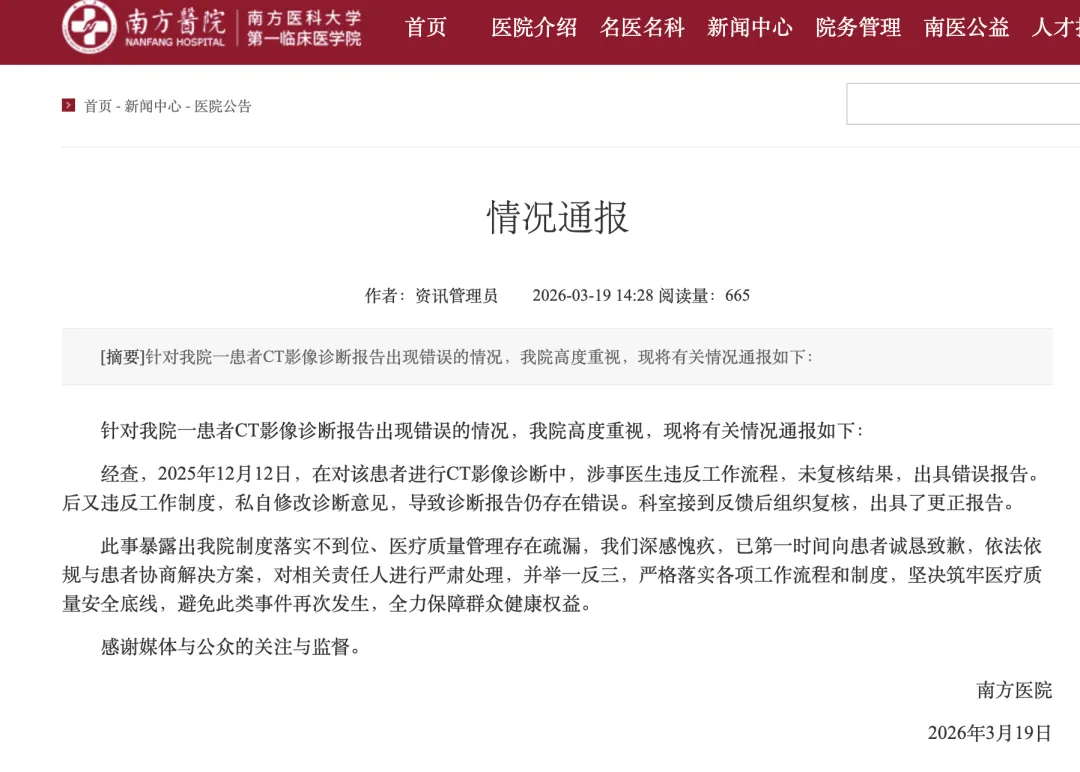 3月19日,针对“患者同一部位CT报告两周内三次结果不一”事件,南方医院发布情况说明,就此次医疗失误向患者及公众致歉——