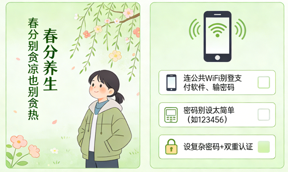 春分别贪凉热,上网别图省事忘安全!连公共WiFi时,别轻易登录支付软件或输入密码;密码别用简单组合,设复杂密码并开启双重认证,既不影响使用便利,又能筑牢安全防线。