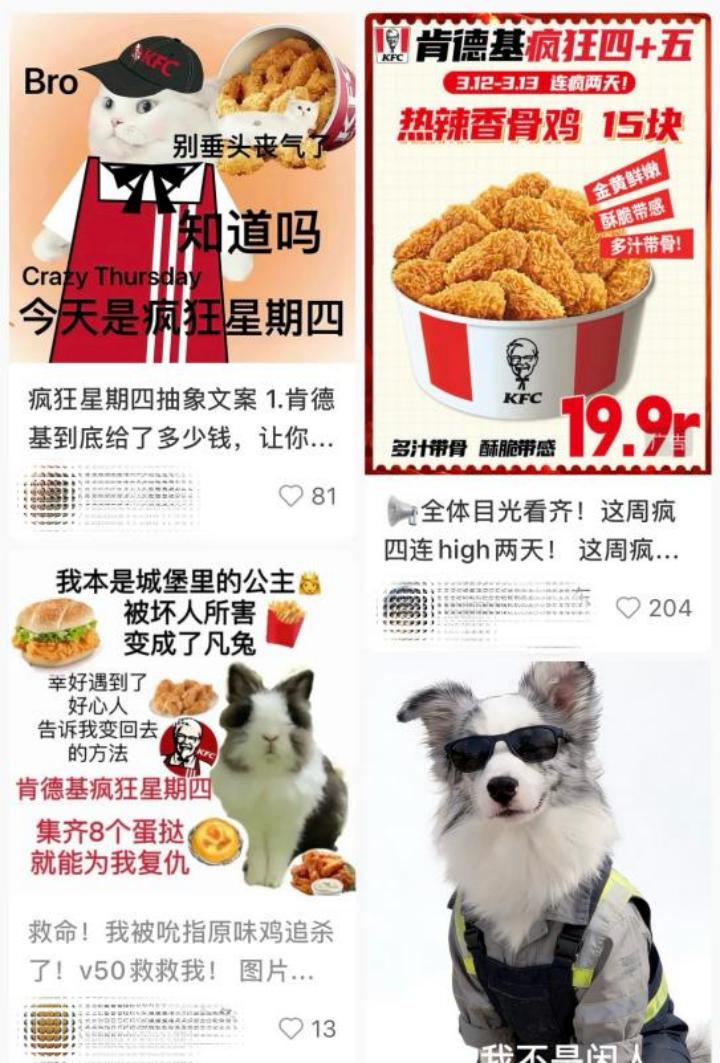 最高级是造梗,如KFC“疯狂星期四”,创造品牌专属可持续话题,这种玩法可遇不可求。