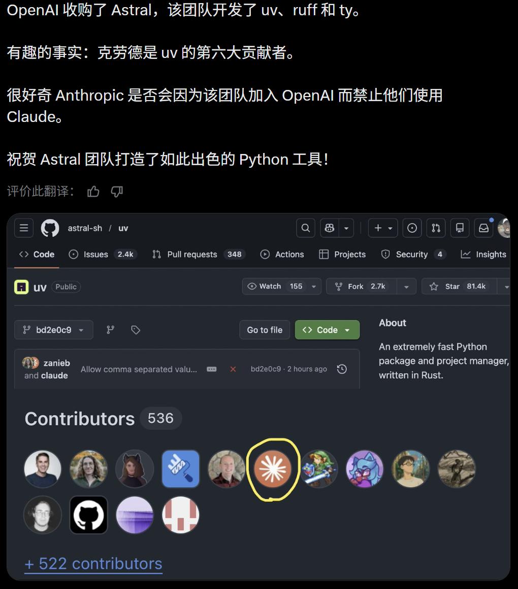 对Anthropic而言,Astral被收购是直接打击:有人发现,在Astral主导的部分开源工具中,Claude已是重要代码贡献者。