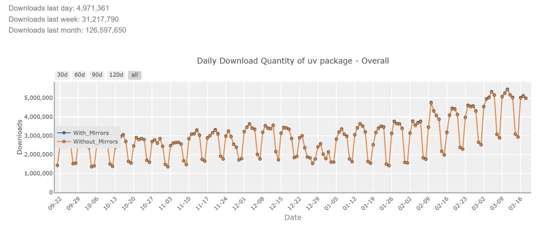这些工具堪称现代Python开发的必备品,让Astral在开发者社区声誉卓著。仅过去一个月,uv下载量就超1.26亿次,数百万开发者每天高频使用其工具。