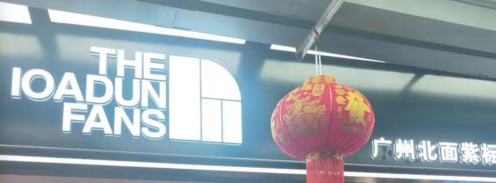 广西网友在南宁步行街买了件北面,进店时店员喊“欢迎光临北面”,回家越看越像高仿,再去店里才发现,店头写的是“THE LOADUN FANS”,旁边标着“广州北面紫标服饰有限公司”,但logo和北面的“山坡”图案很像。