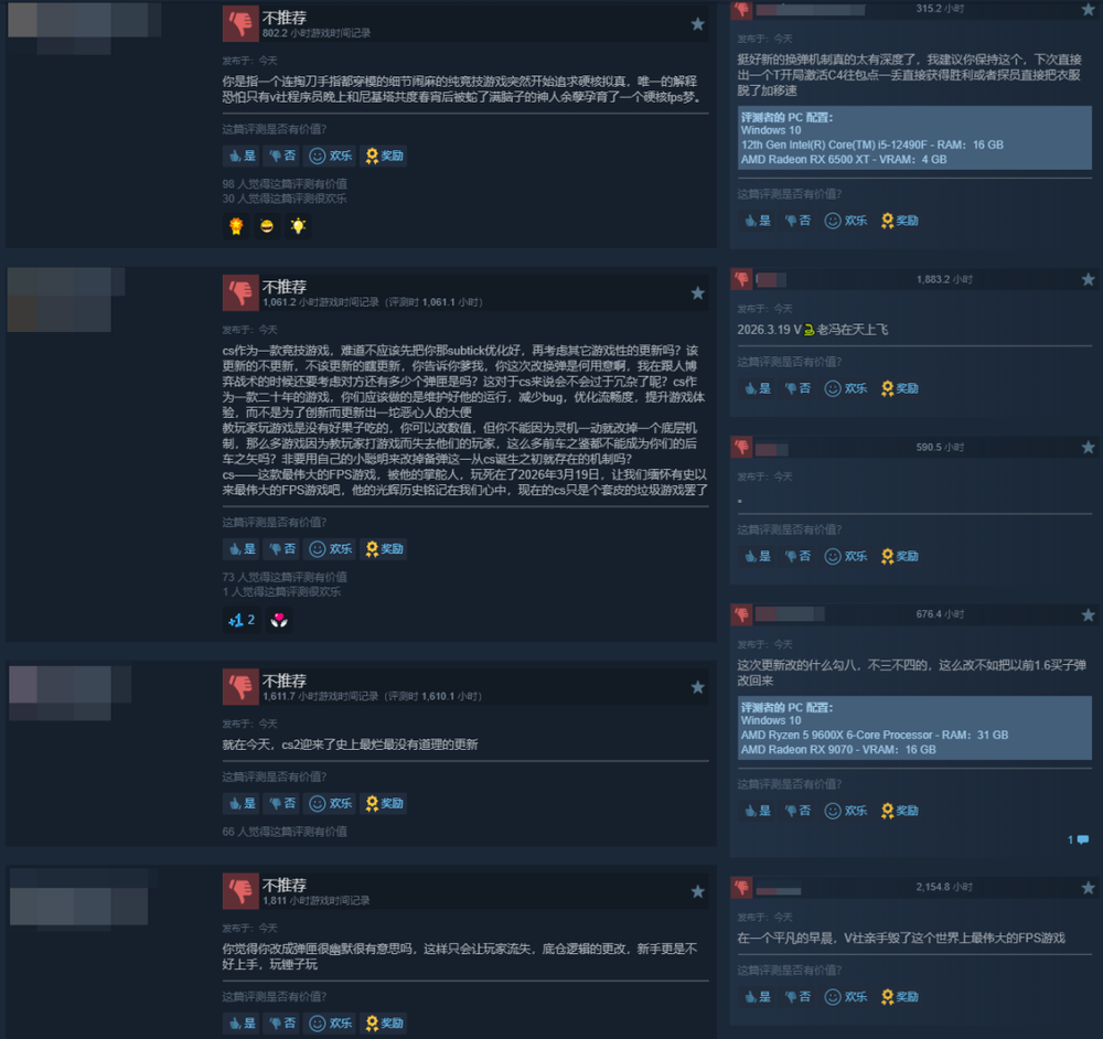 但如此底层改动仅为平衡枪械,且未经测试、未沟通社区就上线,被指“教玩家玩游戏”。社区反应强烈:Steam更新日志零点赞,3月19日CS2好评率仅31%,普通玩家到职业选手都表达不满,有人称“V社毁了最伟大的FPS”。