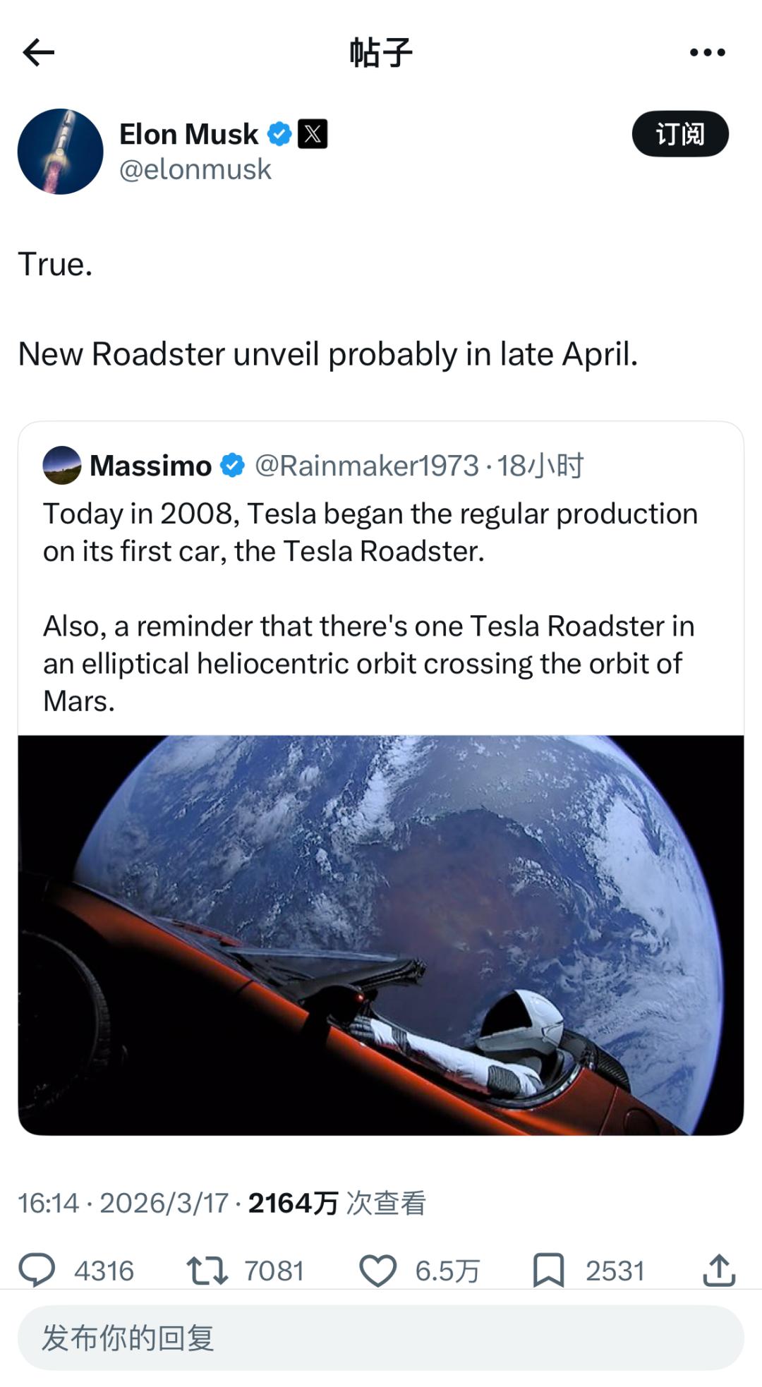 无独有偶,自动驾驶推动者马斯克本周在社交平台发文:“新款Roadster可能4月下旬发布。”