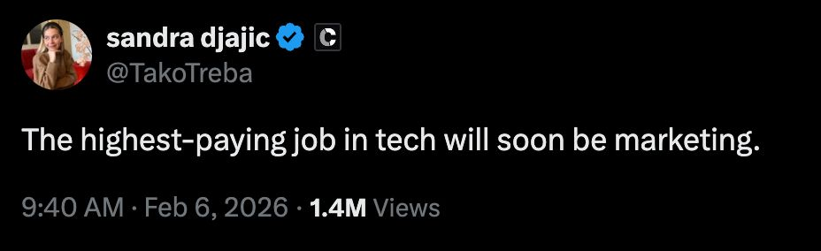 上手AI不难,做产品也变得容易,但懂用户需要长期积累。这让营销在算力竞赛中占据了先天优势。x.com上有个热门帖子就提到:“营销将成为科技企业未来最高薪的工作”,已有数百万人浏览。