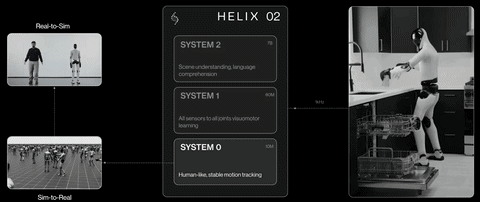 在原有Helix的System 2和System 1之下,System 0插入了以1 kHz运行的全身控制器,负责平衡、接触及全身协调。该层级通过超1000小时关节级人体运动数据,结合大规模仿真到现实的强化学习训练而成,约1000万参数的网络替代了超10万行手写C++控制代码。
