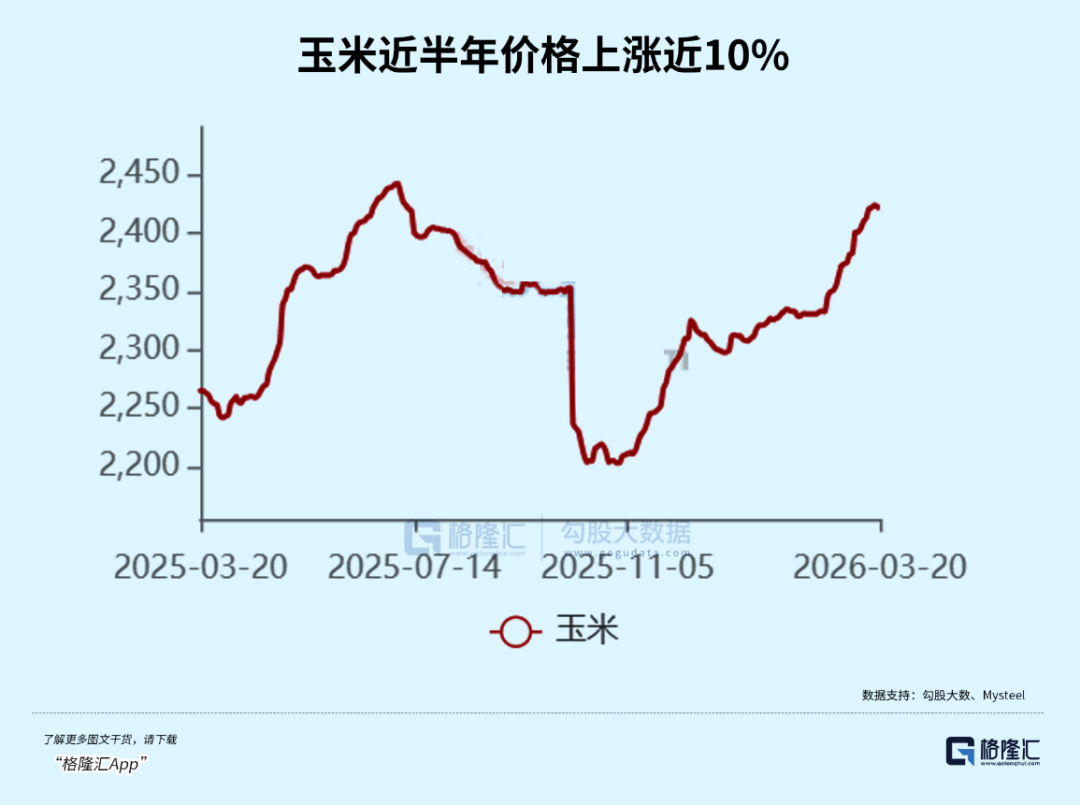近期农产品价格大幅上涨,猪饲料主原料玉米近半年涨近10%,豆粕年内涨超10%。