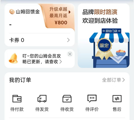 山姆升级卓越会员每月可获得返利|来源:山姆App