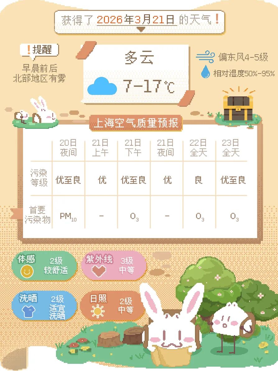 今日多云,全天气温在7到17℃之间,偏东风4至5级,相对湿度95%~50%。