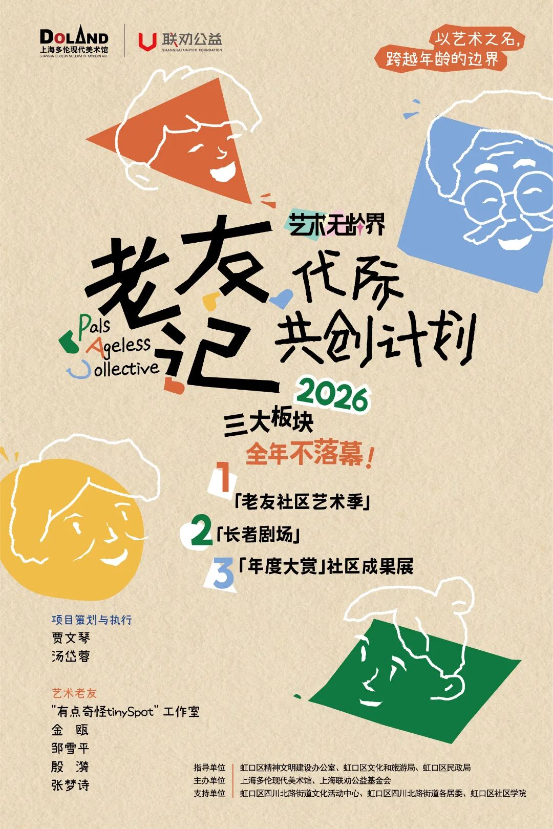上海多伦现代美术馆扎根虹口、服务本地居民,携手专注老年议题的联劝公益基金会,联动四川北路街道文化活动中心、各社区居委会及区社区学院,并邀请“有点奇怪tinySpot”工作室、金瓯、邹雪平、殷漪、张梦诗等艺术家深度参与,将艺术实践从美术馆展厅延伸至社区弄堂,让艺术真正贴近生活、温暖长者。