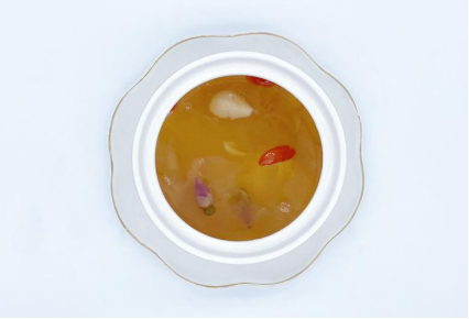 步骤:先将干银耳、百合提前泡发;在锅中放入泡发好的银耳、百合,加入清水煮40分钟;接着放入玫瑰花、陈皮、桑葚、山楂,煮15分钟后捞出这些食材;最后加入枸杞点缀,用冰糖调味即可。