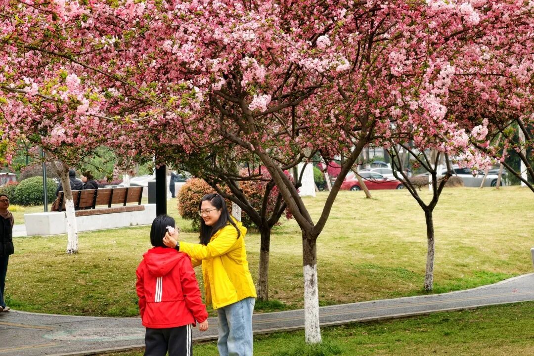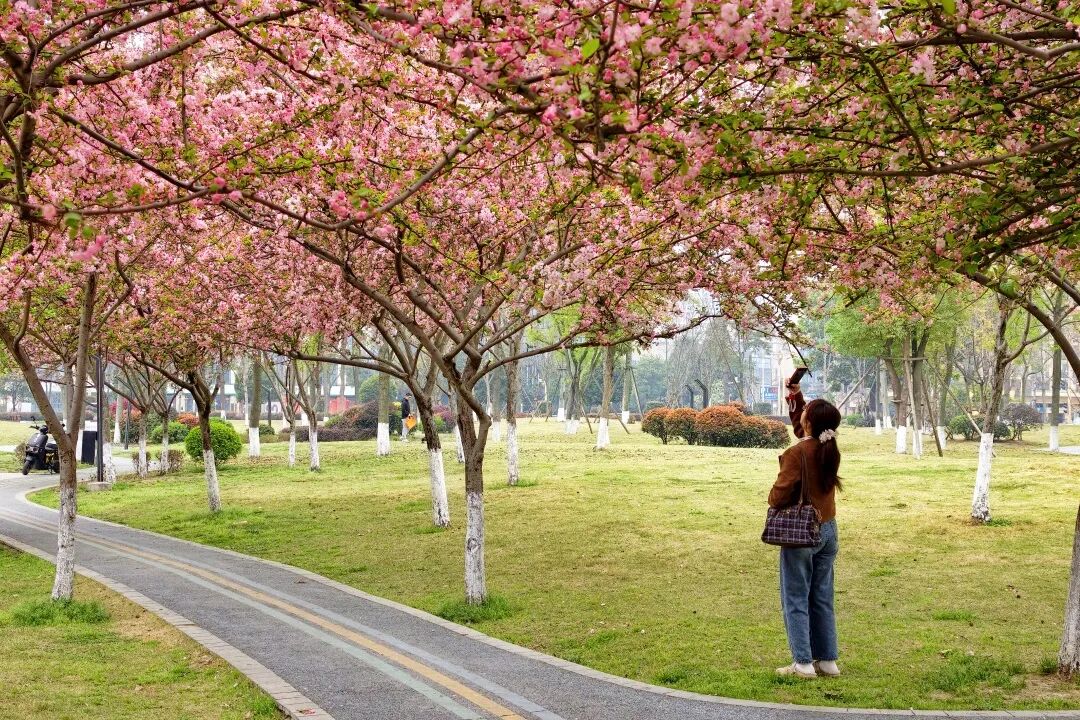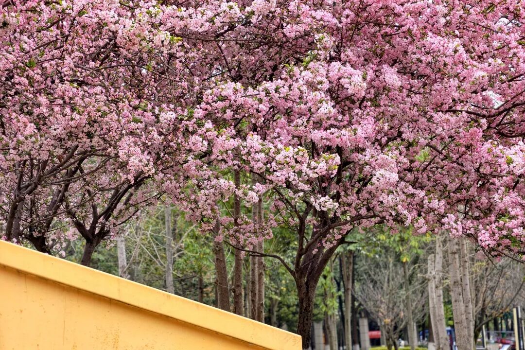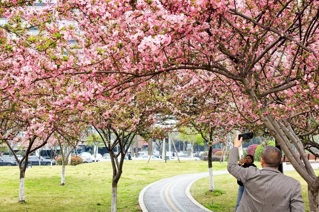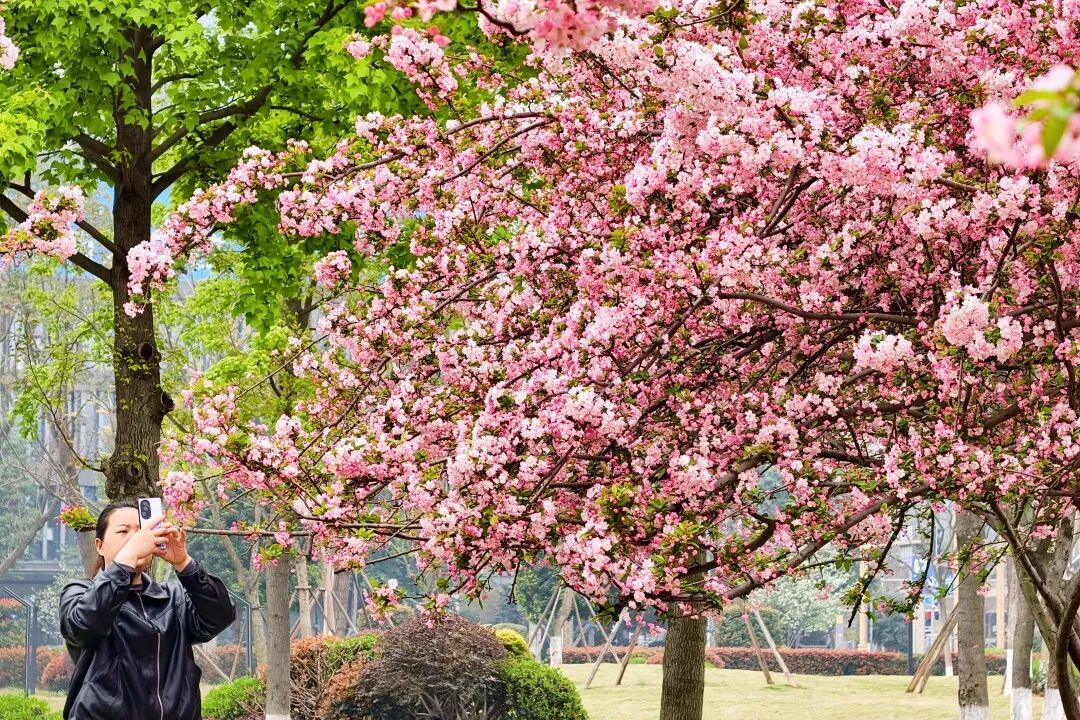 一树树粉红垂挂枝头,如霞似雾,早已吸引了不少市民游客前来打卡赏花。