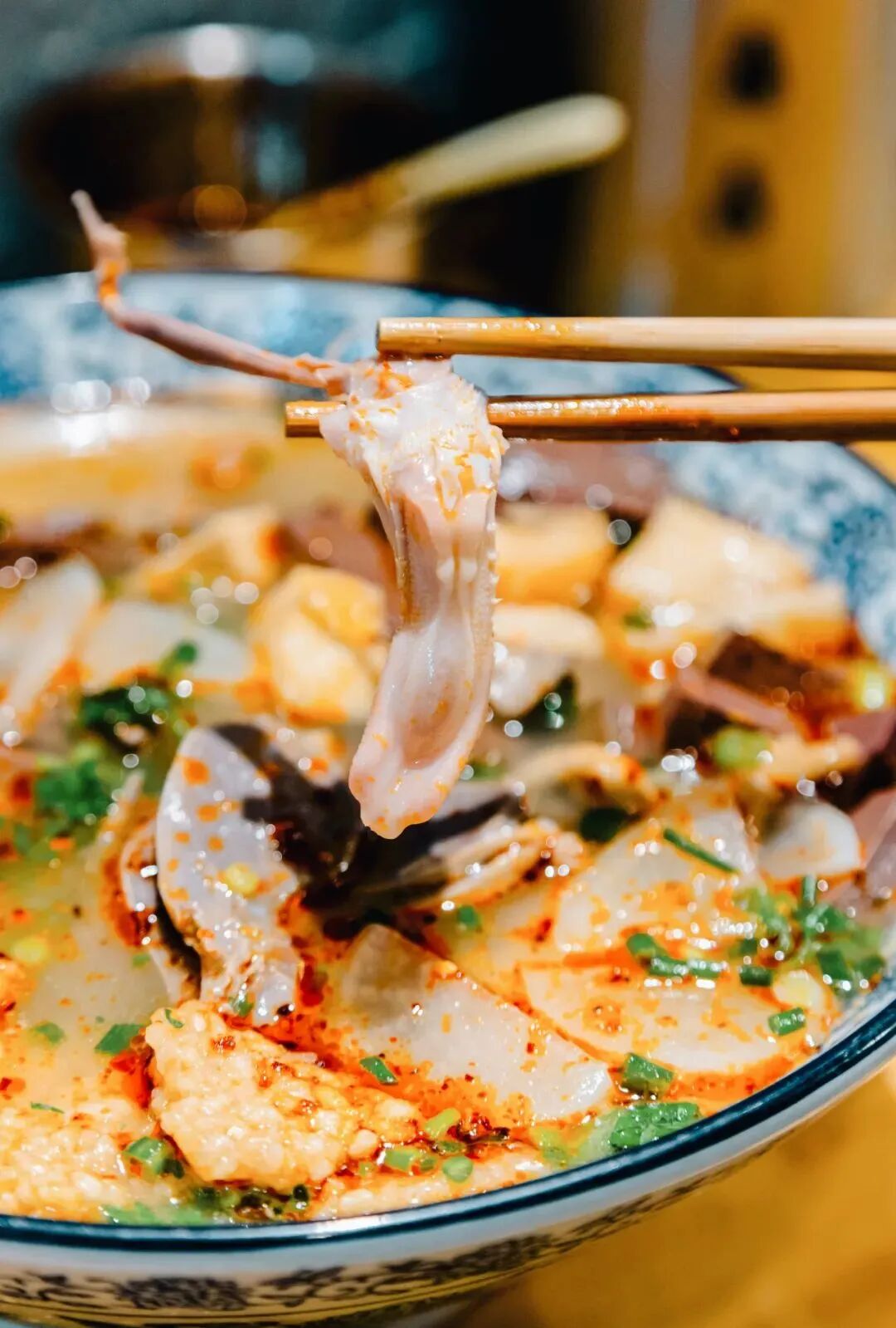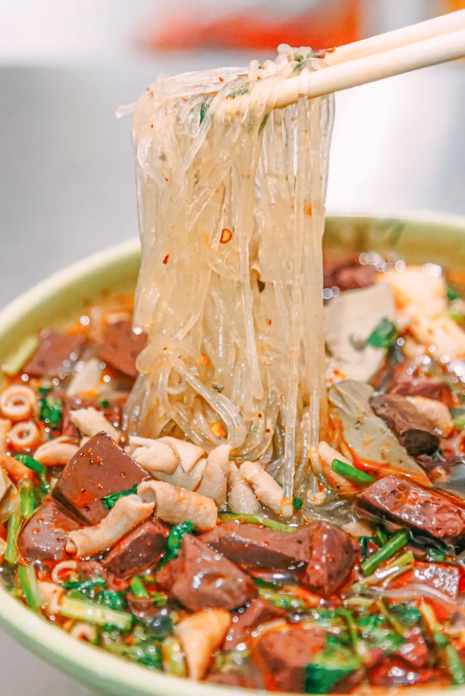 金原鸭血粉丝汤:很多人喜欢去锁金村总店,嫩滑的鸭血、爽脆的鸭肠搭配细滑的粉丝,口感丰富满足。