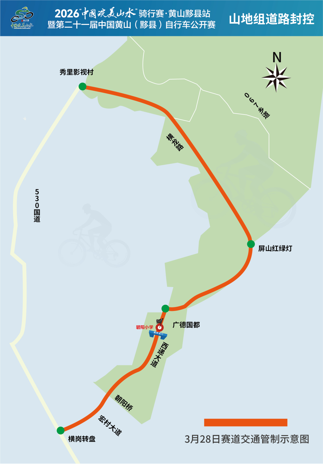 2026“中国皖美山水”骑行赛·黄山黟县站与第二十一届中国黄山(黟县)自行车公开赛,定于3月28日至29日在黟县举办。为确保赛事安全有序开展,赛事期间将对部分道路实施交通管制,具体事项通告如下: