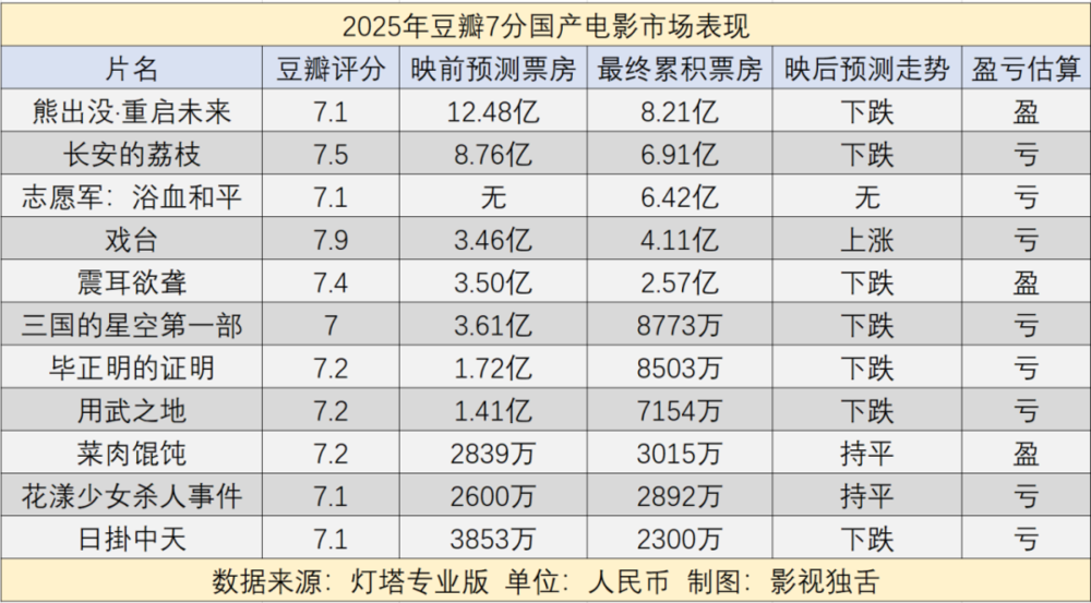 2025全年及2026至今,豆瓣7分区间国产片仅《熊出没·重启未来》《震耳欲聋》《菜肉馄饨》《飞驰人生3》靠票房实现盈利。